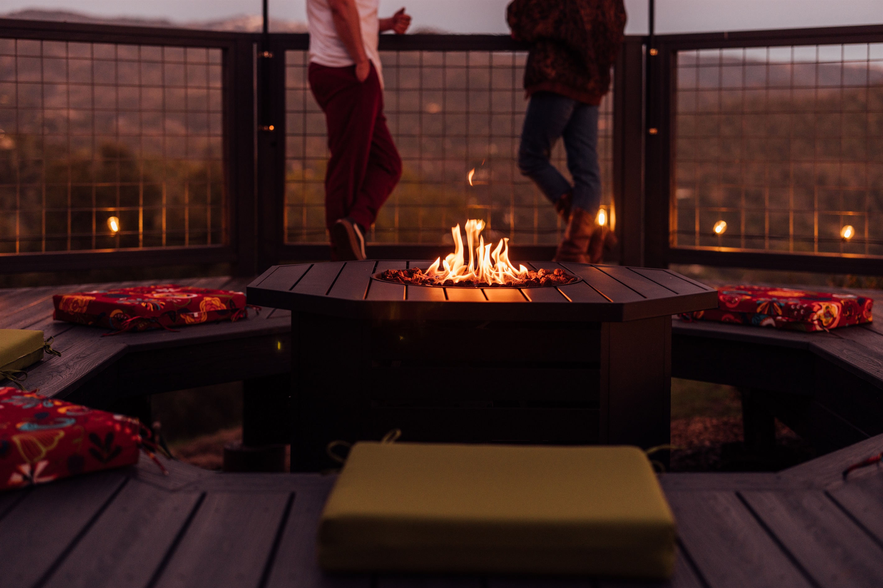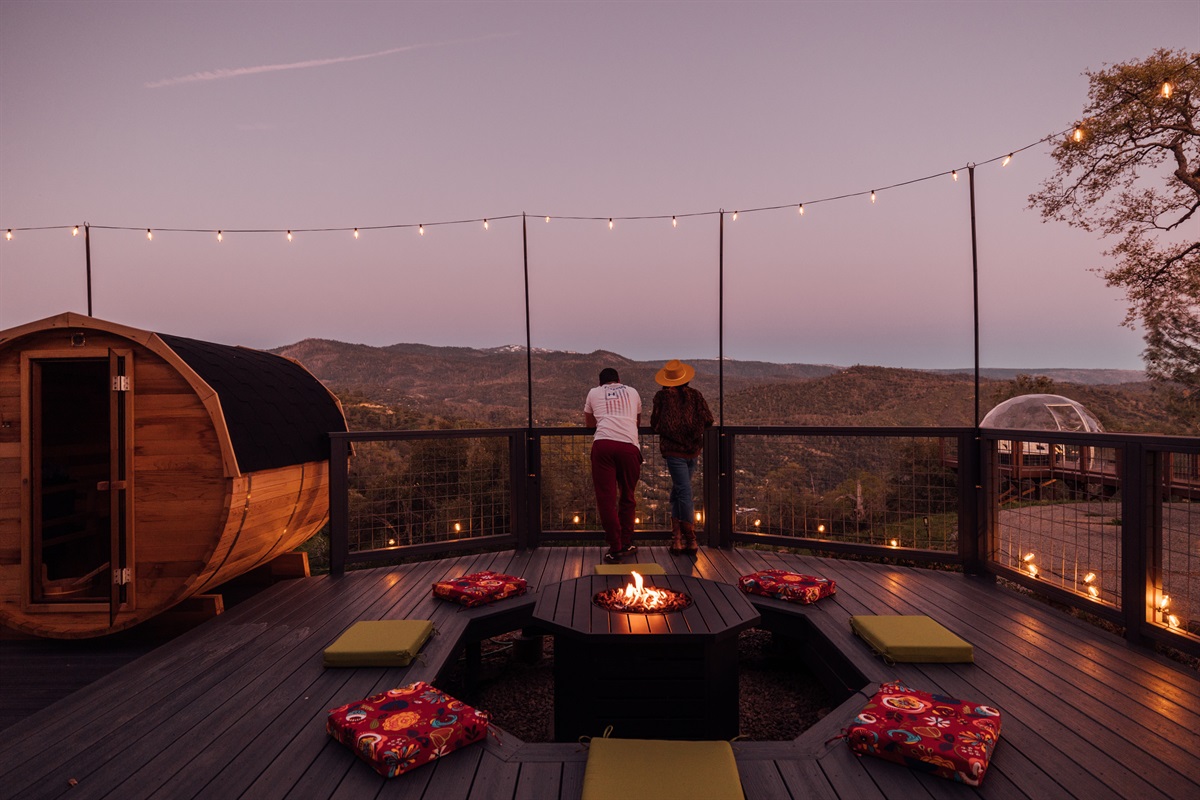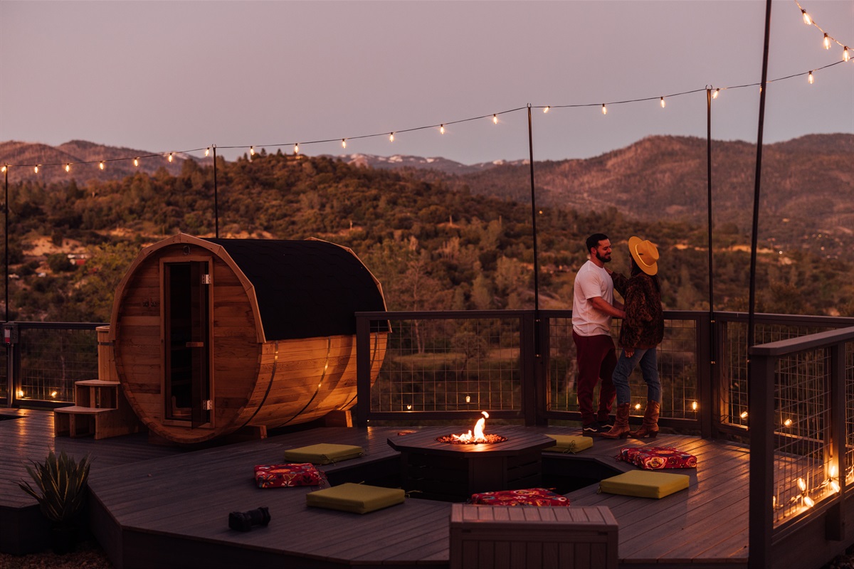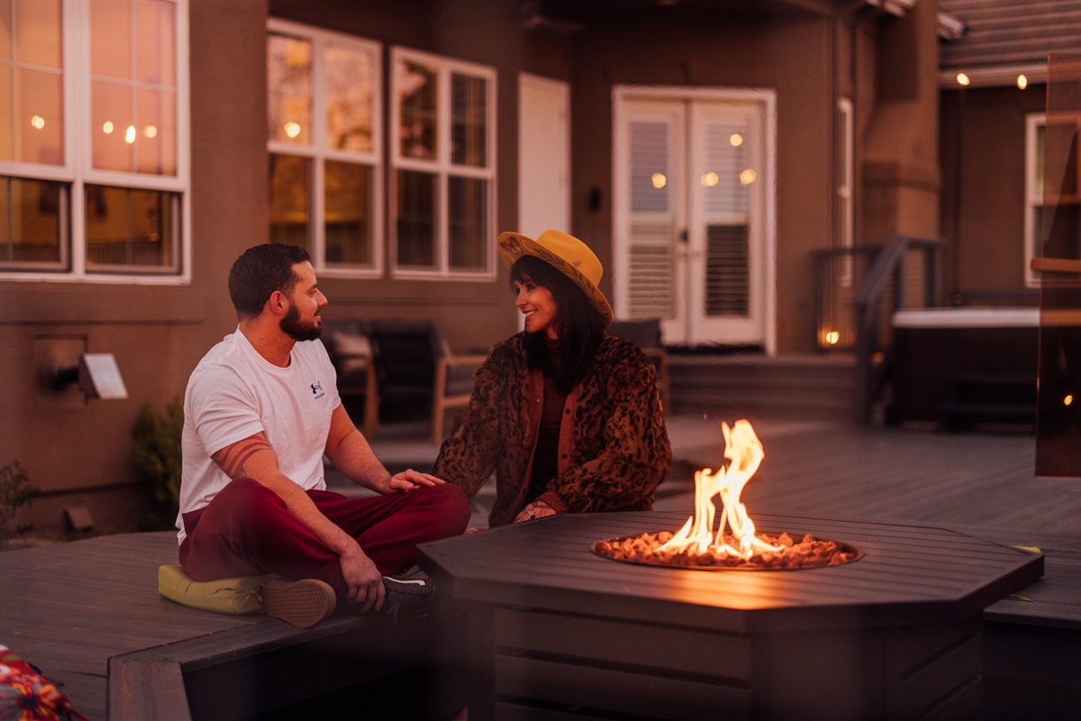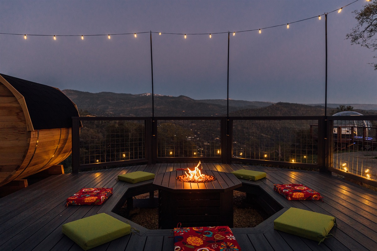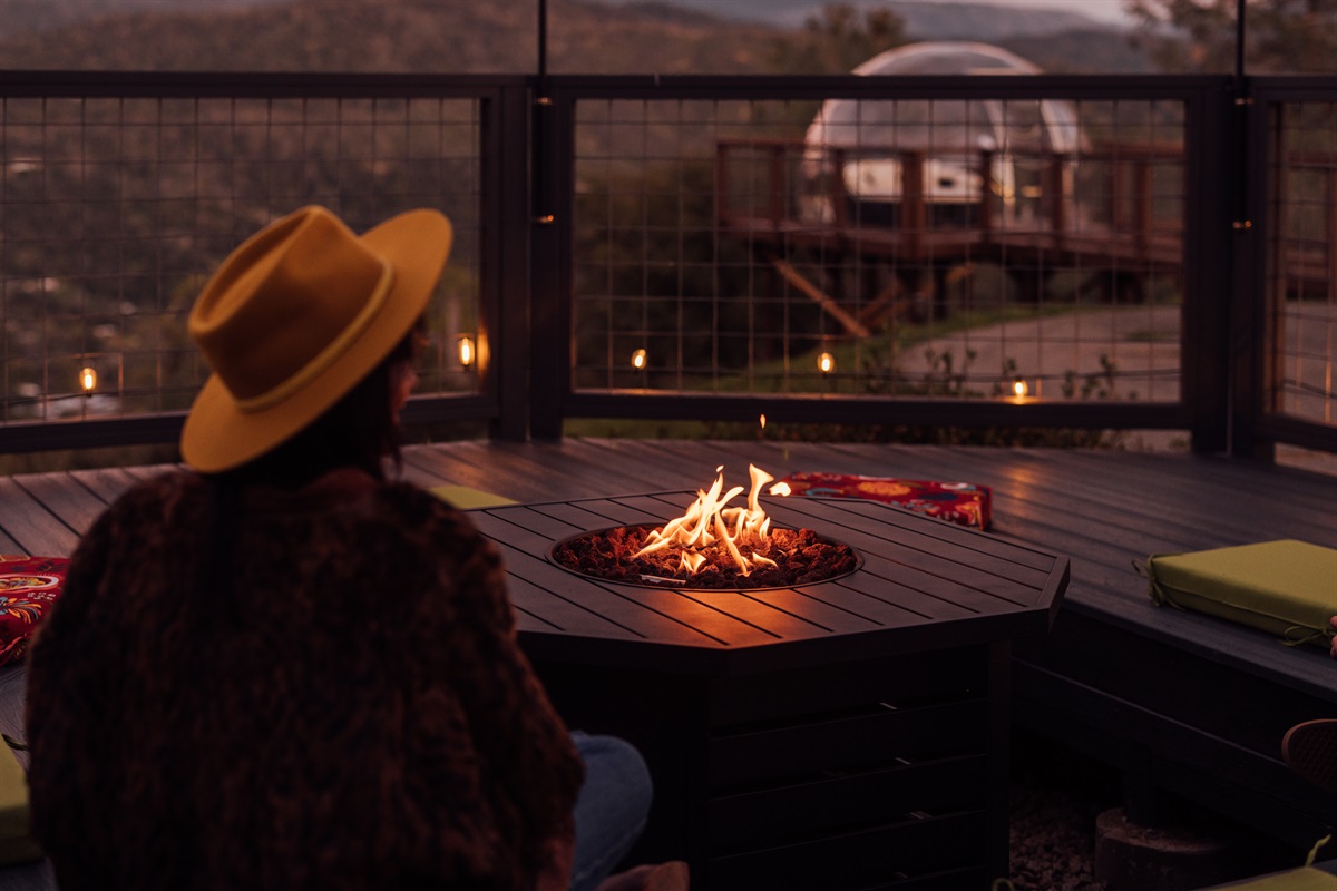 ►The Firepit Deck: An octagonal propane fire pit area with ample seating for pink-sky sunsets.