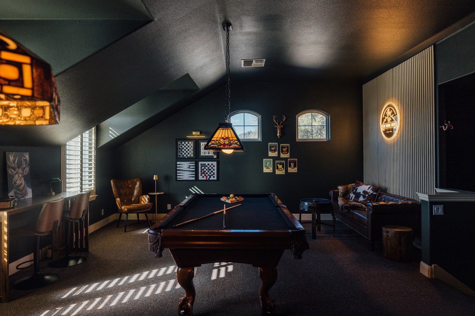 ► Sierra Stash Speakeasy: Private bar with a pool table, poker table, and vinyl record player for vintage vibes.
