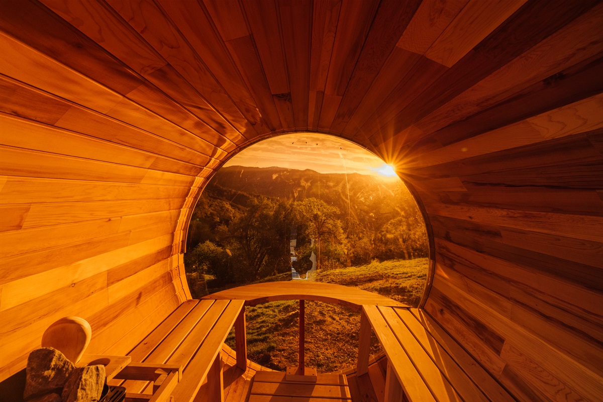 ► Wellness: Hot Tub overlooking the mountains, Barrel Sauna, and Cold Plunge with sunrise valley views.